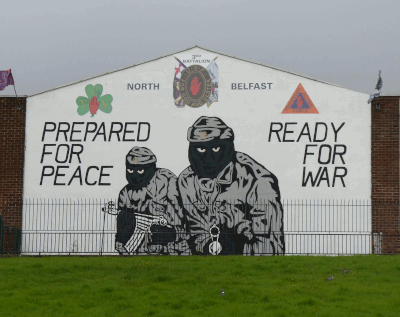 In Belfast sah ich eine Hausfassade, auf der martialisch erscheinende Kämpfer verkünden: "Prepared for peace – Ready for war." Eine klare Ansage der probritischen Loyalisten.