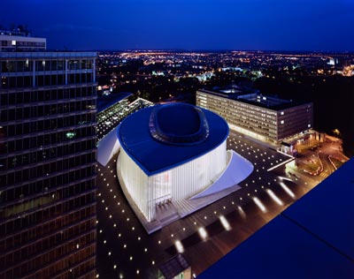 Die Philharmonie am Place de l'Europe am Kirchberg wurde von dem Franzosen Christian de Portzamparc erbaut. Im Sommer 2005 eröffnet, ist sie seitdem auch Heimat des Orchestre Philharmonique du Luxembourg (OPL). Die Form ist elliptisch, und 823 weiße Säulen geben dem Gebäude seine ungewöhnliche Form. Tagsüber kann man hinausschauen, aber nicht hinein, und am Abend leuchtet die Philharmonie von innen wie eine bunte Laterne. Das Haupt-Auditorium ist erstaunlicherweise sehr altmodisch wie ein Schuhkarton gebaut, mit Sitzen an den Seiten und der Loge für die großherzogliche Familie am weiten Ende gegenüber der Bühne. Die Akustik ist besonders gut, was auch daran liegt, dass sich der Architekt eine Klimaanlage der besonderen Art ausgedacht hat. Anstatt einer großen findet man unter jedem Sitz eine seltsame runde Vorrichtung. Das sind Hunderte von kleinen Mini-Klimaanlagen, die weder zu hören noch zu spüren sind, aber geräuschlos für gute Luft sorgen. - Das Programm ist bewusst sehr weit gefächert. Es gibt viele Begleitveranstaltungen und rund 180 Vorstellungen für Kinder und Jugendliche im Jahr.