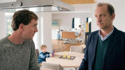 Oliver Lessmann (Jan Krauter) misstraut dem Pflegedienst, den ihm der Gutachter Carsten Kühne (Peter Heinrich Brix) empfohlen hat. | Bild: Radio Bremen/Christine Schröder