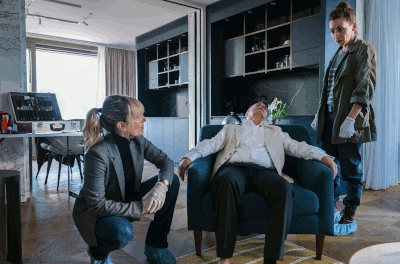 Es gibt ein prominentes Mordopfer zu beklagen: Tessa Ott (Carol Schuler, re.) und Isabelle Grandjean (Anna Pieri Zuercher) untersuchen das Mordopfer James McDermott (David Chrisman). | Bild: ARD Degeto/SRF/Sava Hlavacek