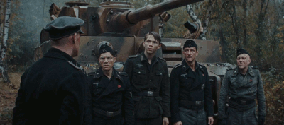 David Schütter spielt den Panzerkommandanten, und mit ihm scheint von Anfang an irgendwas, also "rein innerlich", nicht ganz koscher zu sein. Man sieht einige Tagtraumfetzen, einerseits aus glücklichen Sommer-Friedenszeiten mit seiner Freundin, andererseits aus einer dauerbrennenden Perspektive heraus, letzteres wohl mehr als Alptraum: lichterloh brennende Häuser, aus denen Menschenschreie zu vernehmen sind - die Aufklärung dieses ihn peinigenden Traumas erfolgt zum Schluss: Bei einem Einsatz in Stalingrad befahl er die Inbrandsetzung einer Häuserzeile, hinter deren Fassaden Russinnen und Russen zusammengetrieben worden waren; also ein Massaker = Kriegsverbrechen; und sein früherer Soldatenkumpel und Freund Paul von Hardenburg (Tilman Strauß) war eigentlich dagegen und litt seither nicht minder an diesem barbarischen Gau, bei dem er live zugegen sein musste - ihn wiederum, der es inzwischen zum Oberstleutnant der Wehrmacht brachte, mit dem Tiger im feindlichen Niemandsland aufzuspüren und hinter die Frontlinie zurückzuholen, war der Auftrrag der fünf- bzw. vierköpfigen Panzerbesatzung (Sebastian Urzendowsky als Funker Keilig ging dabei drauf). Und als sie den Gesuchten schließlich fanden, kommt es zur Wiederbegegnung zwischen Gerkens & v. Hardenburg, und sie plappern sich moralisierend und philosophierend gegenseitig voll à la Der-Krieg-hat-keinen-Sinn-mehr oder Alles-verloren usw. usf.