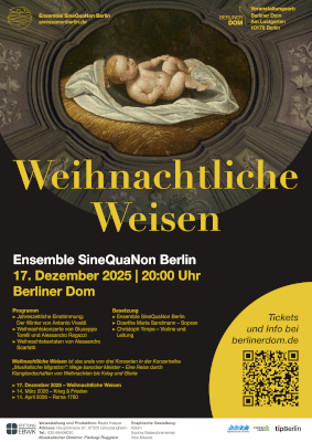 Unter dem Titel "Weihnachtliche Weisen" lädt das Berliner Ensemble SineQuaNon am 17. Dezember 2025 um 20 Uhr in den Berliner Dom zu einem festlichen Konzertabend ein. Das Programm bildet den Auftakt des neuen Zyklus "Musikalische Migration – Wege barocker Meister", der sich mit den Wegen, Einflüssen und Begegnungen barocker Komponisten im Europa des 17. und 18. Jahrhunderts beschäftigt.
