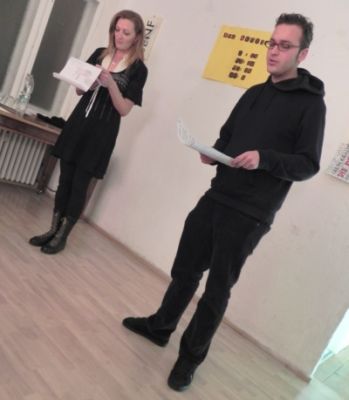 Zusammen mit Schauspieler Nils Panik interpretierte die Textartistin Karin Krautschick szenisch ihr Sprachexperiment.