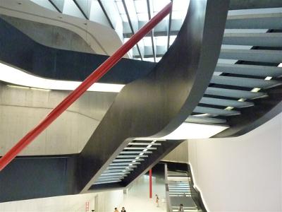 Von außen ist der Museumsbau nüchtern und unauffällig, im Hof sieht er aus wie alle zeitgenössischen Museen, und im Inneren dominiert kruder Beton, der manchmal den Eindruck aufkommen lässt, das Museum sei noch nicht ganz fertig. Als erstes frappiert eine grenzenlose Platzverschwendung. Der Info Desk verschwindet fast in der großen und weiten Leere. Sogar widow, ein riesiges Trompe l’oeil von Anis Kapoor, erscheint klein und handlich. Eine gigantische schwarze Treppe rankt sich durch alle Stockwerke, unterbrochen von den riesigen roten Maccaroni von Federico Marchetti, die ungeordnet im Raum und zwischen der Treppe hängen. Man denkt an Kaufhaus-Rolltreppen oder die Gefängnis-Radierungen von Piranesi, vor allem aber an den deutschen expressionistischen Stummfilm (ich musste an Das Kabinett von Dr. Caligari denken und bin ziemlich sicher, Zaha Hadid hatte das womöglich auch getan). Höhenangst darf man keine haben. Man geht entweder über Gitter oder über durchsichtiges Glas; auf jeden Fall sieht man immer das, worüber man gerade schreitet - doch man kann natürlich auch den Lift benutzen. Ein Besuch des MAXXI ist aber auf jeden Fall lohnenswert und spannend, zumal – wie auch jetzt – meistens verschiedene Ausstellungen zur gleichen Zeit laufen.