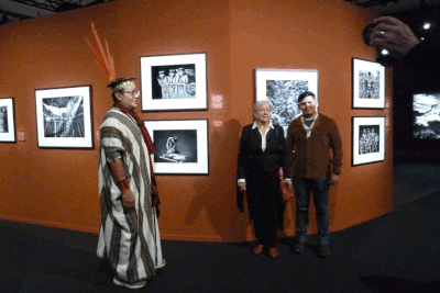 Die Salgados zeigen die überwältigende Schönheit des Regenwalds und die Lebensweise einiger Stämme, die bis dahin keinen Kontakt zur Außenwelt hatten. In der mehr oder weniger abgedunkelten großen Halle leuchten einige der riesigen Schwarz-Weiß-Bilder, und Wolken, Baumwipfel und Flusslandschaften scheinen im Raum zu schweben [s. Foto unten]. Es gibt kleinere Nischen, in denen die Porträtaufnahmen der Indigen zum Betrachten einladen mit Videoaufnahmen von Ältesten, die über das Leben der Bewohner und z.B. über die Auswirkungen der Brandrodungen und Abholzungen sprechen. Auf den Bildern sind auch Francisco Piyãko, Beto Marubo und ihre Familienmitglieder abgelichtet. Die Frau auf einem der Plakatmotive ist Piyãkos Tante Julieta. Er selbst ließ sich für die Pressefotografen auch vor diesen Fotos aufnehmen und hatte sich zu dem Anlass in ein traditionelles Gewand gehüllt.