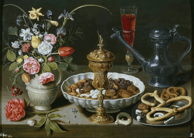 Künstlerinnen gab es im 17. Jahrhundert wenige, und ihre Motivpalette beschränkte sich auf Familienportraits, Selbstportraits oder eben Stillleben. Die unbekannte, niederländische Künstlerin Clara Peeters (um 1590 bis 1655 ca.) brachte all das, was der Adel oder wohlhabende Kaufleute auf ihrem Tisch sehen wollten, auf die Leinwand. Ein aussagekräftiges Beispiel ist das 1611 entstandene Stillleben mit Blumen, goldenem Kelch, Mandeln, getrockneten Früchten, Bonbons, Keksen, Wein und ein Zinnkrug. Es misst 53 x 73 cm und hängt im Madrider Prado.