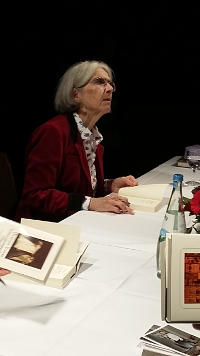 Die schmale Dame wirkt trotz ihres Alters von 74 Jahren erstaunlich agil und gewinnt die Sympathie der Zuhörer auf eine überaus charmante Art sofort für sich. Mit fester, warmer Stimme liest sie einige englische Passagen aus ihrem neuesten Roman Ewige Jugend. Es handelt sich um den inzwischen 25. Krimi der Reihe um den kultivierten Commissario Brunetti (erschienen bei Diogenes), dessen Plots allesamt in der Wahl-Heimat der gebürtigen Amerikanerin spielen: Venedig. Nach 100 Seiten habe Leon die erste Fassung des Manuskripts verworfen, um den Inhalt dahingehend umzugestalten, dass die Leser Mitgefühl mit dem Opfer empfinden. Entgegen dem ersten Entwurf stirbt die heute 30jährige nicht, sondern verbleibt in Folge eines Sturzes in den Canale Grande vor 15 Jahren mit einer geistigen Behinderung. Ihre Großmutter, eine Contessa, die man stellvertretend durch die Person Leon auf der Bühne sitzen sieht, glaubt nicht an einen Unfall und beaufragt den Commissario mit Nachforschungen.