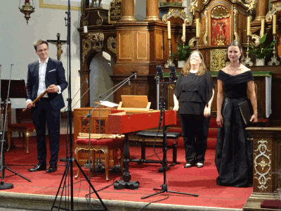 Flötist Max Volbers, Cembalistin Wiebke Weidanz und Sopranistin Marie-Sophie Pollak (von links nach rechts) beim Abschlussapplaus in der Pfarrkirche Sankt Pankratius in Boppard-Herschwiesen | Foto © Ansgar Skoda
