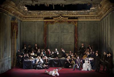 Die fürs Szenische verantwortliche Frauen-Crew - aus Lydia Steier (Inszenierung), Katharina Schlipf (Bühne), Ursula Kudrna (Kostüme) und Johanna Wall (Dramaturgie) bestehend - hob bei ihrer Sicht der Dinge nicht besonders auffallend von derzeit anderen Regiehandschriften, wo es hinsichtlich Barockoper zumeist entweder ziemlich lustig oder ziemlich drastisch zugeht, ab. "Man" suchte eher eine Lösung in der Mitte, was dann das Gesamtverständnis der an sich schon ziemlich schwachsinnigen Story noch mehr in Verruf geraten ließ - also, ihr kreativen Mädels, Beides und auf einmal geht anscheinend auch nicht: lustig/drastisch (Kitsch & Folter); nein, ihr hättet euch dann schon für eine Grundgefühlslage entscheiden müssen - - habt ihr aber nun mal nicht. Völlig zurecht daher die aufgebrachten Buhs, die exklusiv für euch nach dem Premieren-Ende galten!
