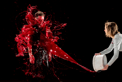 Dann gibt es minutenlanges Action-Painting von Maja Beckmann, die auf einem bühnenfüllenden Tuch eimerweise Theaterblut über Nils Kahnwald kippt. Ein schönes Schüttbild aber auch ein Stück Racherausch und Erniedrigung des Gegners. Dann wird geduscht, wobei die Livekamera lange auf Maja Beckmann bleibt. Die Reflexion hin zum Thema Scham bringt dann Hans Löw als Ajax Frau Tekmessa mit ein paar antiken Versen. Er will Ajax vom Selbstmord zurückhalten. Das bleibt wie ein Fremdkörper in dieser lieber rumalbernden, unfertig wirkenden Inszenierung, die schon wieder zu einem weiteren Thema springt, in dem sie nun die Zweitbesetzung zur Zweitbesetzung ins Spiel bringt. Nachdem Maja Beckmann lieber doch nicht vom hereingefahrenen Standgerüst ins Schwert springen will und Nils Kahnwald die Geduld verliert, kommt Pauline Rénevier im gleichen Kostüm und soll den Job übernehmen. Als Sarah Lane, das Körperdouble für die Schauspielerin Natalie Portman in dem 2010 gedrehten Tanzfilm Black Swan von Darren Aronofsky, erzählt sie nun ihre Geschichte als zu kurz gekommene Zweitbesetzung, auf deren Körper man das Gesicht der Hauptdarstellerin projizierte. Eine frühe Form der KI. Dann geht es noch um Deepfake-Videos und die Scham, in einem so erstellten Porno im Internet missbraucht zu werden.