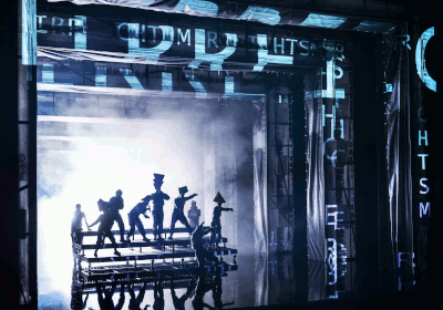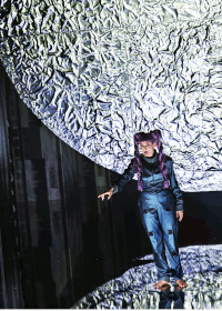 Lübbe geht hier den naheliegenden Weg, den Text nicht nur zu bebildern, sondern die Songs auch in choreografierten Nummern darzubieten. Neben Annie Lennox sind das u.a. Bon Iver, Alphaville, Portishead oder David Bowie, deren Songs diesen Abend bestimmen. Irgendwann landet das sogar bei der bekannten Helene-Fischer-Nummer Atemlos. Die Bühne von Katrin Nottrodt besteht aus innereinander verschachtelten Portalen, auf die in Großbuchstaben Textfragmente projiziert werden. Begleitet wird die Hauptperson von den Schauspielern Tilo Krügel als älterer Herr, Christoph Müller als Mutter und Michael Pempelforth als innerer, Zweifel säender Dämon namens Scheitan mit blauen Trollhaaren. Zwischendrin hängt die Inszenierung leider dramaturgisch etwas durch. Es dominieren meist eingeschobene Bühnenrequisiten wie eine Ziege, ein Raumschiff oder ein riesiger silberner Mond. Der Text von Maren Kames trägt den Abend nicht durchweg über die zwei Stunden. Musikalisch und darstellerisch ist das trotzdem ein Genuss. Das Ensemble wird am Ende nicht unverdient gefeiert. Zum angestrebten Gesamtkunstwerk wird die Inszenierung aber leider nicht.
