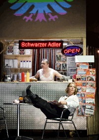 Der Goethe wird groß als Videoprojektion auf die hohen Holzwände des durchaus bemerkenswerten Bühnenbilds von Christina Schmitt projiziert. Ein sich wie bei Alexander Denic beständig drehendes, bühnenfüllendes Gebilde aus Holzgerüsten und einem kleinen Kiosk mit Metalltischen und Stühlen davor, der das Lokal „Zum Schwarzen Adler“ darstellt. Hier lernen die beiden Harrys auch die Prostituierte Hermine kennen. Katrin Wichmann gibt sie betont fröhlich aufgekratzt, wie sie dem vergeistigten Harry abkanzelt und ihm schließlich doch das Tanzen lehrt und mit ihrer Freundin Maria (Juliana Götze) zusammenbringt. An Sketschszenen ist die wuselige Inszenierung von Lilja Rupprecht wahrlich nicht arm. Helmut Mooshammer und Natali Seelig glänzen noch als sich über Jazz streitendes deutsches Touristenpaar mit peinlichem Schuldkomplex in Israel. Vom Jazzer zum Jizzer.