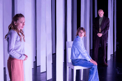 Leonie Rebentisch führt die Inszenierung wie ein psychologisches Kammerspiel. In einem von einem Plexiglasdach hängenden Papierlamellenwald (Bühne: Sabine Mäder) treten die DarstellerInnen für kurze Spielszenen auf, die sich teilweise überschneiden. Ein Regiekniff wie auch das anfängliche Körperschattenspiel des Ensembles hinter dem weißen Vorhang im Hintergrund. Auf der Suche nach der Wahrheit werden immer wieder wütend Papierlamellen abgerissen, als ließe sie sich dahinter finden. Eine psychologische Studie ge- und enttäuschter Ost-Generationen, aber auch lesbar als eine über perfiden staatlichen Machtmissbrauch an Minderjährigen. Die Krimi-Spannung will leider nicht so recht zünden, und auch als historischer Themenabend ist die Inszenierung nicht wirklich gedacht.