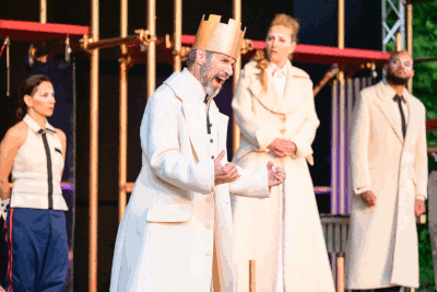 Freud und Leid des Sommertheaters treffen hier aufs Beste zusammen. Auch davon kann das Ensemble schon zu Beginn ein Liedchen singen. Auch einen Schnellkurs im Deckenzusammenlegen gibt es gratis fürs Publikum vorweg. Dann geht es direkt in die Tragödie Shakespeares, in der am Anfang der alte König Lear das Reich an seine Töchter verteilen will, was ihm am Ende aber teuer zustehen kommt. Gespielt wird vor einem dreiseitigen Stahlgerüst, das auch beklettert werden kann. Schlichtes Weiß dominiert die Kostüme (Ausstattung: Kathrin Hegedüsch).