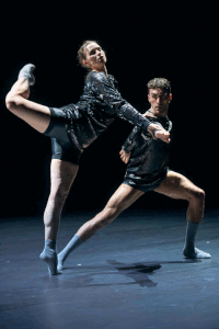 Auf der Bühne liegt zunächst nur schwaches Licht, später leuchten Lichtkegel stroboskopisch. Die Tänzer drehen in körperbetonten Glitzer-Outfits Pirouetten zu perkussiven Elektro-Klängen vom Band. Auch männliche Tänzer legen sich auf Spitzenschuhen mächtig ins Zeug. Queere Vielfalt ist so nicht nur bei wechselnden Pas-de-deux angesagt. In der ersten Choreografie All for one (A.K.A. Spiral) belebt das Ensemble eindrücklich eine skulpturale Licht-Installation. Vor dem Hintergrund komplexer rhythmischer Strukturen entwickelt sich rasant eine kraftvoll sich steigernde Performance mit wechselnden Solos.