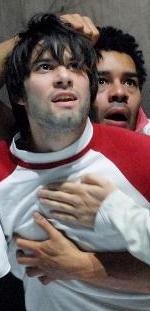 Max Simonischek als Hamlet wird von Michael Klammer als Horatio an Schopf und Herz gepackt in der sportifen Inszenierung Tilmann Köhlers am Berliner Maxim Gorki Theater - Foto (C) MGT