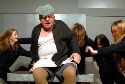 Der sensationell gut spielende Bernd Stübner, hier als Oma, in den von Armin Petras dramatisierten Clemens-Meyer-Erzählungen unter dem Titel Als wir träumten Foto (C) Schauspiel Leipzig