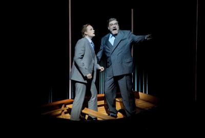 Das sind Benjamin Bruns und Franz-Josef Selig (als Steuermann und Daland) in der Neuinszenierung des Fliegenden Holländer bei den Bayreuther Festspielen 2012 - (C) Bayreuther Festspiele/Enrico Nawrath