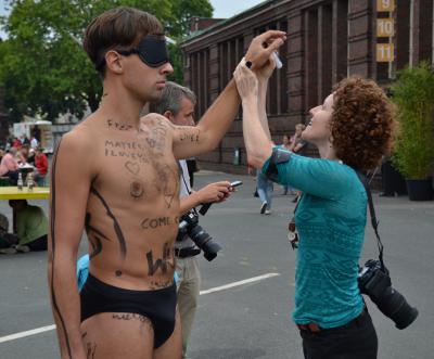 Wieder in den Uferstudios angekommen, fällt ein junger Mann auf, der gleich einer Adonis-Statue mit verbundenen Augen auf einer kleinen Plattform steht. Herumliegende Farbstifte laden zur Körperbemalung ein. Ein kleines Schild erklärt den Hintergrund. „I thought of a wall … I thought to create the space, to make myself space, to become space … I thought to be a wall.” (M.G.) Die Intension des Performers, seinen Körper als öffentlichen Raum zu verstehen und als Oberfläche für Botschaften anderer anzubieten, wird von den Umstehenden dann auch bereitwillig aufgegriffen.