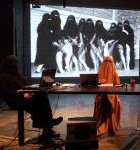 Aber unter der Burka steckt viel mehr – und dazu bedarf es eines zweiten und tieferen Blickes. Denn als eine der Damen plötzlich zum Mikrofon greift und sich mit tiefer Stimme als Mann entlarvt, wird klar, dass man sich von Äußerlichkeiten nicht täuschen lassen sollte. Passend zu den aktuellen Geschehnissen rund um das NSU-Verfahren werden als Kontrast Texte vorgetragen, die Sarrazin selbst nicht besser hätte formulieren können. Unterbrochen wird das durch die Einspielung eines Videos, auf dem zu sehen ist, wie eine Gruppe von Burka tragenden Frauen zu orientalischer Musik wild in einem Raum tanzen und damit gegen diese rechtsextremen Gedanken ankämpfen. Menschliche Gefühlsausbrüche, die auch die Burka tragende Darstellerin nicht mehr auf dem Stuhl halten und höchst amüsant wild tanzen lässt.