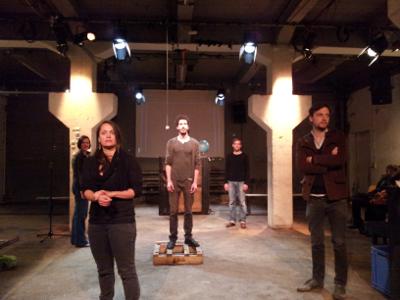 Diese Zahlenfolge wird fast bis zum Schluss ununterbrochen und in Endlosschleife, im Chor und manchmal auch einzeln, in den Raum geschrien, während man schon fast irritiert ist, welchem Schwachsinn, der sich gerade auf der Bühne abspielt, folgen soll. Denn überall passiert was – und das möglichst hektisch und/oder auffällig. Während eine Schauspielerin mit einer Leiter an einer Säule hoch klettert, um sich oben niederzulassen, quasselt eine andere Details über Ihre Anatomie und körperliche Leiden in ein Mikrofon, das von der Decke herunter baumelt. Einer spielt Töne auf einem Klavier, während ein anderer auf der Stelle dribbelt und ein weiterer Steine im Raum verteilt. Ab und an ist auf einer Leinwand ein Video von einer futuristischen Zukunft zu sehen. Im Nachfolgenden wird, als sei es wie bei einem pinkelnden Hund, Wasser an einer Säule heruntergeplätschert, während ein daneben kniender Herr Steine auf den Boden fallen lässt. Eine Schauspielerin läuft durch das Publikum und wedelt mit einem Taschentuch, das mit einem angenehmen Duftstoff versetzt ist – dies ist wohl der einzige wohlige Moment der Inszenierung, denn als einer der Schauspieler seine Jacke anzieht und den Raum für kurze Zeit verlässt, möchte man am liebsten mitgehen. Nachdem man neben diversen anderen Unsinnigkeiten - das wilde Rennen einer Schauspielerin von rechts nach links und von links nach rechts, ähnlich einem Staffellauf - über sich ergehen lässt, sehnt man sich schon nach dem Ende dieses Debakels. Aber so einfach wird es dem mittlerweile unruhig gewordenen Zuschauer nicht gemacht. Eine Darstellerin steuert einige Leute im Publikum an und fragt: „Welche Hoffnung habt ihr schon aufgegeben?“ Da möchte man am liebsten antworten „dass ihr endlich damit aufhört.“ Und nachdem man sich schlussendlich Anekdoten und Vorschriften aus der DDR angehört hat und sich auch ansah, wie mit Kreide auf dem Boden gemalt wurde, kehrt nun auf der Bühne wieder etwas Ruhe ein. Der Zahlenrhythmus, der sich längst schon in die Köpfe eingebrannt hat, verstummt, und die Klänge von Oasis Wonderwall versprechen ein Ende, bis auch das mit einem lauten Knall daherkommt.