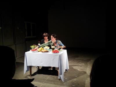 Nachdem man diesen absoluten Tiefpunkt des Abends überwunden hatte, kam die 20-minütige Pause wie gerufen, um sich für das nächste und letzte Stück zu sammeln, welches wieder im Atelier stattfand. Für die Videovorstellung von Hunger & Seide mit dem Titel I want you back! wurden die Zuschauer von einem abgedunkelten Raum in Empfang genommen. Rechts außen auf der Bühne eine Hängematte, auf die ein schwaches Licht gerichtet ist, in der es sich Judith Al Bakri und Barbara Balsei gemütlich machen. Das Video beginnt, und man sieht morgendliche Frühstückszubereitungen. Eier werden in einer Pfanne gebraten, Kaffee wird gekocht, Brot wird geschnitten, und die Haare werden nach dem Duschen geföhnt. Allerdings wird das alles rückwärts abgespielt, so dass man beispielsweise zusehen kann, wie sich das bereits in der Pfanne fertig gebratene Ei immer mehr zum rohen Ei entwickelt, bis es sich wieder in einer zugeschlagenen Schale im ganzen Ei befindet. Schnell wird dem Zuschauer die Besonderheit dieser Inszenierung klar. Hier spielt sich alles rückwärts ab. I want you back – und damit ist wohl die Zeit gemeint. Eine Zukunftsperspektive, die alles Geschehene wieder ungeschehen macht, damit man sich eine neue Zukunft basteln kann. Diese Art der Vorstellung sorgt immer wieder für viel Erheiterung im Zuschauerraum, denn plötzlich sieht man ungewohnte Bilder, wie zum Beispiel einen Staubsauger, der den Raum verschmutzt, statt den Dreck wegzusaugen oder Nudeln, die praktisch ausgewürgt werden, bis der Teller wieder voll ist. Jedoch ist der Effekt des amüsanten „wir lassen die Zeit rückwärts laufen und machen alles ungeschehen“ nach einigen Minuten abgenutzt und berechenbar. Nachdem man ausgewürgte Bananen, ein Schnittlauchbrot oder Tomaten gesehen hat, fragt man sich, wie viel von der Nahrungsmittelpalette wohl auf diese Weise noch abgeklappert wird und wie viel die Schauspielerinnen wohl während der Dreharbeiten zu diesem Video vor lauter Essen an Gewicht zugenommen haben müssen. Aber es wird schließlich nicht nur rückwärts gegessen. Auch zerrissenes Papier wird wieder ganz gemacht und bereits pürierte Erdbeeren in ihren Ausgangszustand versetzt. Nach dem Ende des Videos überraschen die Schauspielerinnen mit einem live rückwärts gesprochenen Dialog, bis sie auch rückwärts aus der Hängematte herauskriechen und einen gedeckten Tisch in den Raum hinein tragen, an dem sie Platz nehmen und wieder das ganze Essen in sich hinein stopfen – diesmal aber vorwärts und begleitet durch Charpentier’s Te Deum. Ob diese Fressorgie eine neue aber doch wieder unveränderte Zukunft ist und uns damit gezeigt werden soll, wie lernresistent die Gesellschaft aus Fehlern der Vergangenheit ist? Diese Frage muss wohl jeder für sich selbst beantworten. Genauso die leider akustisch unverständliche Bedeutung des abschließenden Textes, welches vom Band kam und rückwärts gesprochen aufgenommen und ebenfalls wieder rückwärts wiedergegeben wurde. Dennoch ein interessanter und unterhaltungsvoller Abschluss dieses Abends, der mit seiner Einfachheit und den kreativen Gedankengängen Appetit auf ein Hauptstück im Rahmen einer Fortsetzung des Projekts macht.
