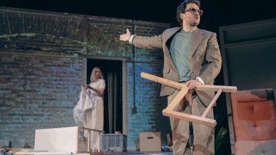 Daher wohl auch der Stücktitel Sabotage. Es ist in der Stückbeschreibung auch von Selbstsabotage die Rede. Ein Jude, der nicht mehr mitspielen will, fürchtet zum „selbsthassenden“ Antisemiten zu werden. Jona geht nicht mehr aus dem Haus und kommuniziert nur noch mit ChatGPT, das er liebevoll Chatty nennt. Dazu plagen ihn noch Panikattacken und eine Steißbeinfistel. Er fühlt sich also im wahrsten Sinne des Wortes „am Arsch“. Seine Depression behandelt die Psychotherapeutin Pia (Eva Meckbach), der der Neurotiker sichtlich auf die Nerven geht. Schaad erinnert hier mit dickrandiger Brille (Kostüme: Amit Epstein) nicht von ungefähr an den jüdisch-amerikanischen Filmregisseur Woody Allen (Der Stadtneurotiker). Hinzu käme eine weitere Ähnlichkeit zum deutsch-jüdischen Regisseur Dani Levy (Alles auf Zucker). Der Bogen zur Komödie ist also gespannt.