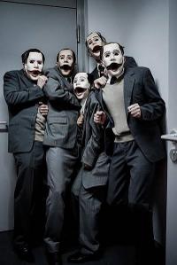 Kriegenburg überführt Kafkas Einzelgänger ins Universelle. Gemäß der Kurzparabel Gemeinschaft gibt es hier gleich fünf Blumfelds (Elias Arens, Moritz Grove, Bernd Moss, Jörg Pose und Natali Seelig), die sich allerdings Anton Blumenfeld nennen, aber genauso gut Müller, Meier, Schulze heißen könnten. Ausstatterin Andrea Schraad hat alle mit Halbmaske, Brille, Anzug und Aktentasche gleichgeschaltet. Otto-Normalbürger, die lieber unter sich bleiben wollen, aber plötzlich aus dem alltäglichen Trott ins Chaos gestürzt werden. Kriegenburg übersetzt das in entsprechend chaotische Wimmelbilder mit schrägen Hängepartien im Bühnenbild, zu denen Nele Rosetz die Texte spricht. Erster Höhepunkt des Abends ist aber mit Sicherheit die Schilderung der Bemühungen von Blumfeld, die daheim vorgefundenen, auf- und abspringenden Zelluloidbälle unter Kontrolle zu bringen. Laura Goldfarb und Lisa Quarg tragen das als doppeltes Lottchen im Stil einer Sportreportage vor.