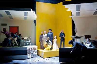 Der eurozentrisch geprägte Blick des Lehrers und scheinbar zu vermittelnde Maximen deutscher Leitkultur provozieren die Schüler. Sie konfrontieren den überforderten Lehrer mit ihrer eigenen Lebensrealität und werfen ihm schließlich gar die gerade verteilten Reclam-Heftchen an den Kopf. Wie bei einer Explosion zerreißt jetzt die Bühne effektvoll in der Mitte. Das Baumaterial bröckelt und die wichtigsten Figuren aus Lessings Drama Nathan der Weise rollen platziert vor gelben Hintergrund wie in einem aufgeschlagenen Reclam-Heft herein (Bühne und Kostüme: Cary Gayler). Dem Lehrer zur Hilfe kommend, werden die oft gekürzten Szenen im schnellen Tempo vorgeführt. Die aus dem Feuer gerettete Recha (Julia Keiling) dankt ihrem Retter, dem Tempelherren (Jan Jaroszek) überschwänglich und überrascht ihn mit erotischen Avancen. Bernd Braun spricht die Ring-Parabel als weiser Jude Nathan bedeutungsvoll. Er ringt jedoch dabei auch um Atem, als ihm der aufgebrachte Sultan Saladin (Daniel Breitfelder) einen Säbel drohend an den Hals legt. In der Vision Nathans scheint die Konkurrenz der Religionen aufgehoben. Judentum, Christentum und Islam mögen sich seinem Wunsch zufolge in einem Miteinander ergänzen statt gegeneinander zu kämpfen. Kommentare der Muslime unterbrechen, hinterfragen und erweitern die vorgespielten Szenen regelmäßig um eigene Gedanken aus der Jetztzeit. Chorisch konfrontieren die Muslime so stets das vorgespielte Geschehen mit ihrer Lebenswirklichkeit. Behandelt werden eigene Diskriminierungserfahrungen, Salafistenwerbung, islamischer Antisemitismus, das islamische Frauenbild und die Ablehnung von Homosexualität im Islam. Klischeevoll weht auch einmal die Fahne des IS, und es wird in die Menge geschossen und eine Kopf-ab-Hinrichtung zelebriert. Doch auch trotz Arab-Pop und Bauchtanz kippt das Geschehen nie zu sehr in Flachheit über, denn die Muslime berichten authentisch vor dem Hintergrund der Nathan-Geschichte über ihre Ängste und die Beweggründe und Einschränkungen ihrer eigenen Religiosität. Sie sprechen über den Zwiespalt hier geboren und im Islam verwurzelt zu sein.