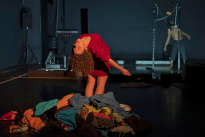Jetzt wird die Tänzerin Charlotte Virgile mit einem Lichtspot fokussiert; sie stampft im Sitzen mit den Beinen auf, sie rastet sichtlich aus und schreit wie wild herum...