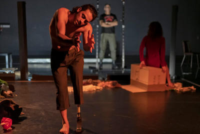 Der Syrer Ashraf Albesch - der von vorhin: "der mit diesen Schritten" - wird von einer Beinprothese aufrichtig gestützt, jetzt (jetzt erst) ist der Mann zu sehen [er war, wie so viele seiner Leidgefährten, auf der Flucht vor Krieg und Terror und gelangte übers Mittelmeer nach Deutschland; eigentlich wollte er anfänglich nach Norwegen, aber der Zufall und das Schicksal hatten es halt anders eingerichtet; nun beweist er sich als Tänzer, doch sein Traum ist Schauspieler zu werden]...