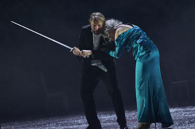 Bösch baut hier immer wieder wie zur Erklärung kleinere Rampenmonologe ein mit Zitaten von Nazigrößen oder Schriftstellern und Dichtern wie Bertolt Brecht, dessen Gesicht kurz bei der mit echten Flammen inszenierten Bücherverbrennung am Bühnenhorizont auftaucht. Koffer stehen hier für Flucht und Vernichtung. Die SA-Kohorten singen "Flieger grüß mir die Sonne" oder anderes nationalistisches Liedgut. Aber die große Dramaqueen des Abends ist Nico Holonics als psychopathologischer Fall und pädophiler Sohn Martin, der als Marlene-Dietrich-Parodie selbst der Lady Macbeth Corinna Kirchhoff die Schau stiehlt. Da wirkt auch der verhinderter Macbeth Peter Moltzen, der tatsächlich zitternd Shakespeare-Verse rezitiert und auch mal mit dem Schwert auftaucht, relativ blass. Bösch macht es recht theatralisch und drückt auch zum Ende voll auf die Drama-Tube. Das Hochzeitspaar Sophie von Essenbeck und Friedrich Bruckmann fällt unter den Schüssen des sich von seiner Übermutter befreienden Martin. Die Nazis sind am Ziel und wie zur Mahnung lässt Bösch noch mal alle blutüberströmten Leichen des Stücks aufmarschieren. Bösch liefert hier eher eine etwas zähe Visconti-Parodie. Wer melodramatischen Shakespeare mag, dürfte auf seine Kosten kommen.