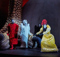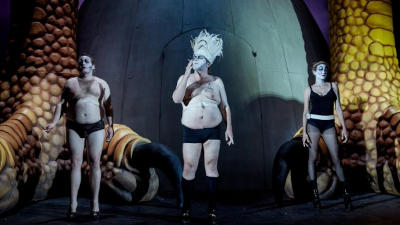 Ersan Mondtags spektakuläre Drehbühne stellt Bildgewalt in den Mittelpunkt. Das komplexe und anspielungsreiche Wut-Drama von Elfriede Jelinek wird erst nach und nach abwechselnd oder im Chor vorgetragen, vielfach gekürzt, erweitert oder variiert. Der sich öffnende Vorhang gibt den Blick frei auf zwei riesige abgeschnittene Adlerbeine und –krallen, die im Bühnenzentrum als Minarette fungieren. Dazwischen liegt so etwas wie ein Ei oder eine Reaktorkammer eines Atomkraftwerks. So wie die Ehrenfelder Moschee äußerlich einem Atomkraftwerk ähneln mag, so erinnert diese Kuppel an eine Moschee. Auch die Rückseite, die im Inneren ein Greenscreen-Studio beherbergt, kommt während der Vorführung vielfach zum Einsatz. Zu Beginn erschallt aus einem Fenster oben im rechten Adlerbein so etwas wie der eindringliche Gebetsruf eines Muezzin (Benny Claessens). Bald variiert Claessens jedoch die Rhythmen seines Gesangs, und es werden Motive aus Elton Johns „Circle of Life“ oder Shakiras „Waka Waka (This time for Africa)“ hörbar. Claesens, der von Elfriede Jelinek höchstpersönlich für diese Rolle ausgewählt wurde, mimt den exzentrischen Bösewicht. Er changiert dabei zwischen Herakles, der dem antiken Mythos nach vor Wut seine Kinder erschlägt, und islamistischen Terroristen. Seine Darstellung erinnert dabei vielfach an schwule Klischeerollen einer Diva. Alle anderen Figuren haben sichtlich Mühe, sich neben ihm zu behaupten. Die Vorführung wird laut, brutal, schrill, trashig und heftig.