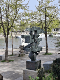 Die Pariser haben zwei Plätze in diesem Skulpturen-Areal zum Parkett erkoren. Als wir dort waren, haben gerade drei oder vier Paare getanzt, und man konnte sehen, dass sie das öfters tun. Für die Tänzer und Tänzerinnen haben die Plastiken eine andere Bedeutung. Sie werden kurzerhand als Aufbewahrungsort für Handtaschen und Jacken umfunktioniert. Aber das soll auch so sein. Die Kunstwerke sind harmonisch in die Landschaft an der Seine integriert, spiegeln sich zum Teil im Wasser oder versuchen, von wuchernden Sträuchern und Pflanzen nicht ganz gefressen zu werden. Die Arbeiten stehen nicht nur in Verbindung mit der Natur, sondern auch mit den Menschen. Man darf sie besteigen, berühren und einige lassen sich zuwuchern und werden zur Heimat von Igeln.