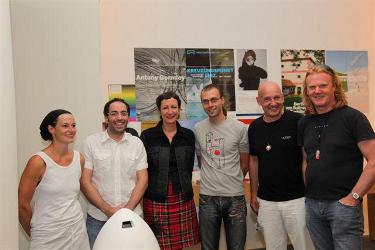 Ein Teil der meraner gruppe in der Galerie im Taxispalais: v.l.n.r.: Sabine Auer, Küchenchef Andre Kassin, die Leiterin der Galerie im Taxispalais Beate Ermacora, Hannes Egger, Peter Tribus und Martin Geier. Auf dem Foto fehlen Peter Schwellensattl, Franziska Egger und Sara Schwienbacher (Foto: meraner gruppe)