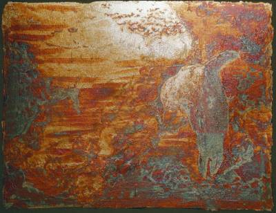 Eine dritte Möglichkeit zeigt das Werk "Goldblatt". Hier habe ich erst ein echtes Blatt auf das Papier geklebt und danach ein Blattgoldblatt darüber gelegt. Das Gold ist so dünn, daß sich das darunter liegende Blatt gut abzeichnet. Auch eine sehr interessante Variante.