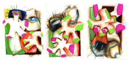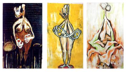 For example, the image "Flower Hands" (see above "three standing figures" - right picture), with its predominately warm and attractive color palette looks benign upon initial inspection. Further analysis reveals a standing female figure with flowers–flowers of anguish, question and confidence–as hands, with a raging emotional, shadow-like energy surrounding the forms as hands. Continued examination reveals that the entire strength of the painting rests in the suggestion of a face containing nothing but eyes, empty to the surface, sad, isolated and hopeful.