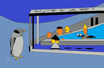 Aber auch große Künstler sind nicht vor ihr sicher. Es gibt eine Adaption von Edward Hoppers Nighthawks, allerdings mit einem Pinguin vor der Tür, Lyonel Feiningers kubistische Darstellung der Marktkirche in Halle [s. o. re.] oder eine Altstadtansicht von Pablo Picasso.