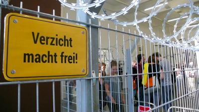 Das Nutella, von dem manche nicht genug kriegen können, ist fingerdick auf eine Box aufgetragen [s. Foto unten]; durch Gucklöcher sieht man eine Traumwelt von Luxus und Genuss, das Ganze ist schön abgesichert durch Stacheldraht. Aus "Zutritt auf eigene Gefahr!" wird "Verzicht macht frei!" Und am Ende steht: "There is no exit!"