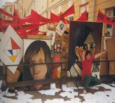 Die Barrikade wurde aus Bildern von bekannten russischen Malern gebaut. Die Künstler veröffentlichten folgende Presseerklärung: