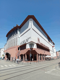 Und draußen scheint die Sonne, und es ist nicht allzu warm; vor ein paar Tagen mussten noch (zum Beispiel in Berlin, wo ich her bin) 37 Grad erlitten werden. Appetit auf ein Salät'chen? Auf der Freiterrasse des Badias Schirn Cafés lässt es sich aushalten... Danach zu Fuß in Richtung Dom - bin freiwillig und trotzdem unverschuldet ins touristische Epizentrum Frankfurts geraten; und das Kaffeehaus Goldene Waage will ich daher auch nicht einfach so links liegen lassen; also noch ein Käff'chen und ein süßes kleines Erdbeertört'chen, warum nicht... Jetzt aber endlich weg von hier! die Domstraße hinunter, und die Braubachstraße überquert; ja und da sehe ich's im spitzen Winkel vor mir stehen, und ich lese an der linken Häuserwand MUSEUM MMK, und an der rechten Häuserwand MUSEUM FÜR MODERNE KUNST [s. Foto o. re.].