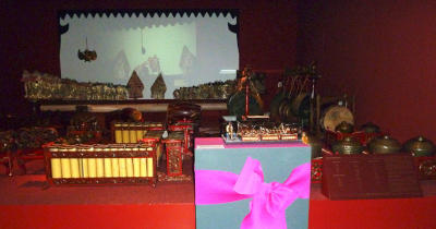 Manche Geschenke passen richtig gut in die Dauerausstellung. So haben die Javanesen und Balinesen 1984 die Miniatur eines Gamelan-Orchesters aus Holz, Metall, Glas und Kunststoff mitgebracht. Die steht jetzt natürlich in dem Ausstellungsraum, das ein solches Orchester mit Originalen beherbergt.