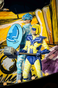 Dittrichs Götterwelt, die er zusammen mit den Bühnenbilderinnen Pia Dederichs und Lena Schmid sowie Kostümbildnerin Mona Ulrich ersonnen hat, sieht aus, als treffe Barocktheater auf Marvel Universe. Wotan thront auf einem großen Mond, Kulissen in Wolkenform werden von links und rechts ins Bild geschoben. Alles ist Pappmaché, auch die Sektflasche, zu der Wotangattin Fricka aus lauter Verzweiflung greift, weil die Sektflöte nicht mehr ausreicht. Fasolt und Fafner werden mit einem papierene Bagger auf die Bühne gezogen. Freia ist ein Mädel mit roter Perücke, stets das Handy zur Hand. Donner und Froh in Comic-Superhelden-Kostümen kämpfen darum, ein möglichst gutes Bild abzugeben (und scheitern). Ein Fest für die Ausstattung.