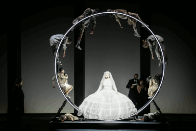 Unten am Boden des Rheins geht es eher karg zu, links und rechts auf der Bühne sichtbar zwei Scheinwerferbatterien, die Rheintöchter und Alberich in Abendkleidung. Und dann fällt einem plötzlich auf, wie schwierig es ist, eine Neuinszenierung von Richard Wagners Tetralogie DER RING DES NIBELUNGEN im Interim zu starten, auf einer Bühne mit wenig Bühnentechnik und ohne Orchestergraben.