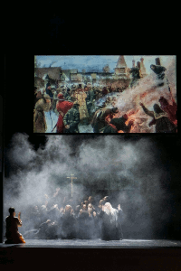 Das sängerische Kern- und Kraftzentrum der Aufführung wurde von dem ukrainischen Bass Taras Shtonda bestimmt - am Schluss des Stücks leitet er die hysteriche Gruppenselbstverbrennung der sog. Altgläubigen, einem sektenartigen Bund der russisch-orthodoxen Kirche in der damaligen Zeit.