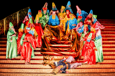 Seine die gesamte Bühnenbreite einnehmende Showtreppe sah zwar mehr als imposant aus, und er vermochte auch das ausführende Personal auf ihr hinunter und herauf zu strapazierern, ohne dass es zu unfreiwilligen Stürzen gekommen wäre; es war zur Unterscheidung der jeweiligen (und im Libretto behandelten) Ethnien entweder in bonbonfarbene Fantasiekostüme (= Babylonier), einheitliche Blaumänner (= Perser) oder chassidische Trachten (= orthodoxe Juden) gesteckt und machte unaufhörliche und für Fritsch so urtypische Grimassen und hamplige Bewegungen, was alles wiederum mit dem Stück an sich - sowieso finden in Oratorien meistens keine zwschenmenschlichen Interaktionen statt, was sie für die Bühne untauglich machen sollte - wenig oder nichts zu tun zu haben schien; o wie das alles in seiner sinnlos-szenischen Aufgesetztheit nervte!