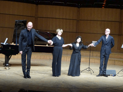 Roman Trekel, Corinna Harfouch, Hideyo Harada und Peter Lohmeyer beim Abschlussapplaus zu Alma und Gustav Mahler in der Kölner Philharmonie | Foto © Ansgar Skoda