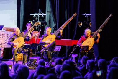 V.l.n.r.: Wolfgang Katschner, Martin Steuber und Hans-Werner Ape von der lautten compagney BERLIN bei ihrem gemeinsamen Konzert mit Mitgliedern der Familie Zawose am 15.11.2025 im Berliner Humboldt Forum Foto (C) Frank Sperling