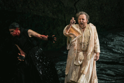 Brenton Ryan (als Loge) und Christian Gerhaher (als Wotan) in Kirill Serebrennikovs Inszenierung von Wagners Reingold - bei den Osterfestspielen Salzburg 2026 Foto (C) Frol Podlesnyi