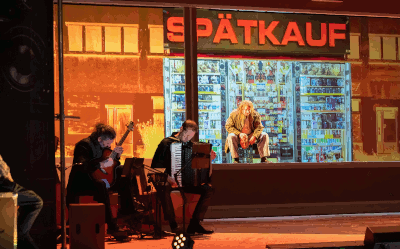 Der Komponist spielte selbst (von der linken Bühnenseite aus) Gitarre und demonstrierte hin und wieder Gebärdensprache, ihm zur Seite saß der auch diverse Sprecheinlagen verübende Akkordeonist Felix Kroll.